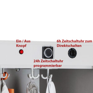 The Drying cabinet is equipped with two different timers. A programmable 24-hour timer enables drying at precisely defined times. For example, it can be set so that work clothes are always dried at night using the low night-time electricity rate. The second timer, a 6-hour direct timer, allows drying to start immediately with a time span of up to 6 hours without having to cancel the programming set with the other timer. The Drying cabinet can be switched off completely at any time using an on/off switch.